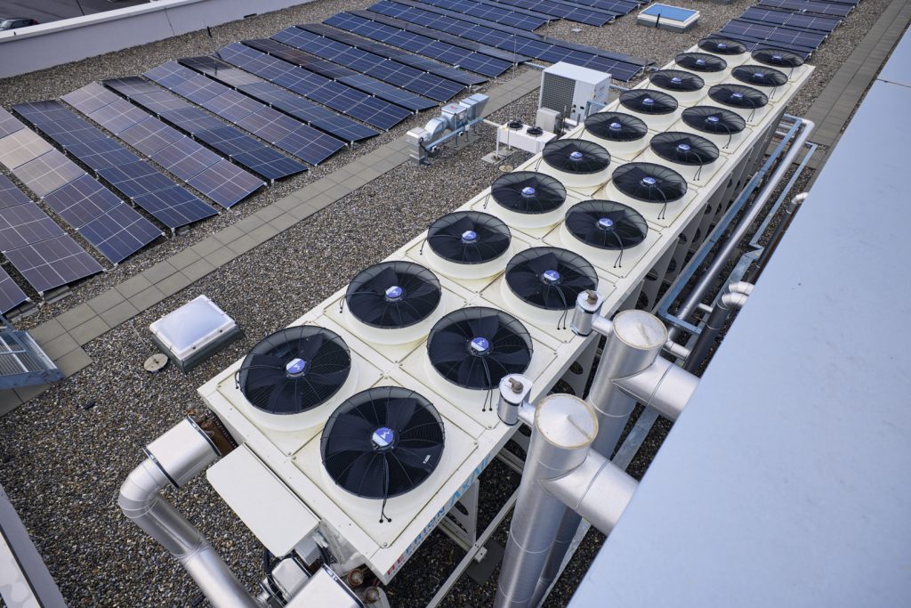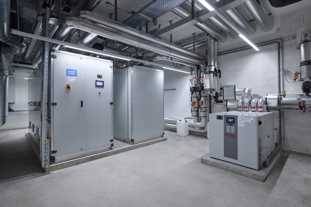 Die Heizung der Werkstätten und Büros des Ausbildungszentrums wird durch zwei leistungsstarke, im Meier Tobler-Werk gefertigte PICO AT Wärmepumpen gewährleistet. Zwei auf dem Dach installierte Luftkühler mit je 206 kW Leistung entziehen der Umgebungsluft Wärme, um die beiden Maschinen zu betreiben. Die Carrier 61WG090 AquaSnap Wärmepumpe, die ausschliesslich für die Warmwassererzeugung eingesetzt wird, wird ebenfalls von den Luftkühlern mit Wärme versorgt und ergänzt die beiden PICO AT optimal.